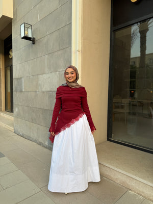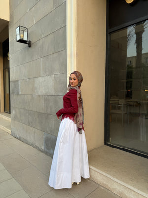 A flowy white poplin skirt featuring a ruched waist and a wide, airy silhouette for a feminine and effortless look. Fully lined for added comfort and coverage. Available in sizes S, M, and L.