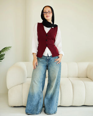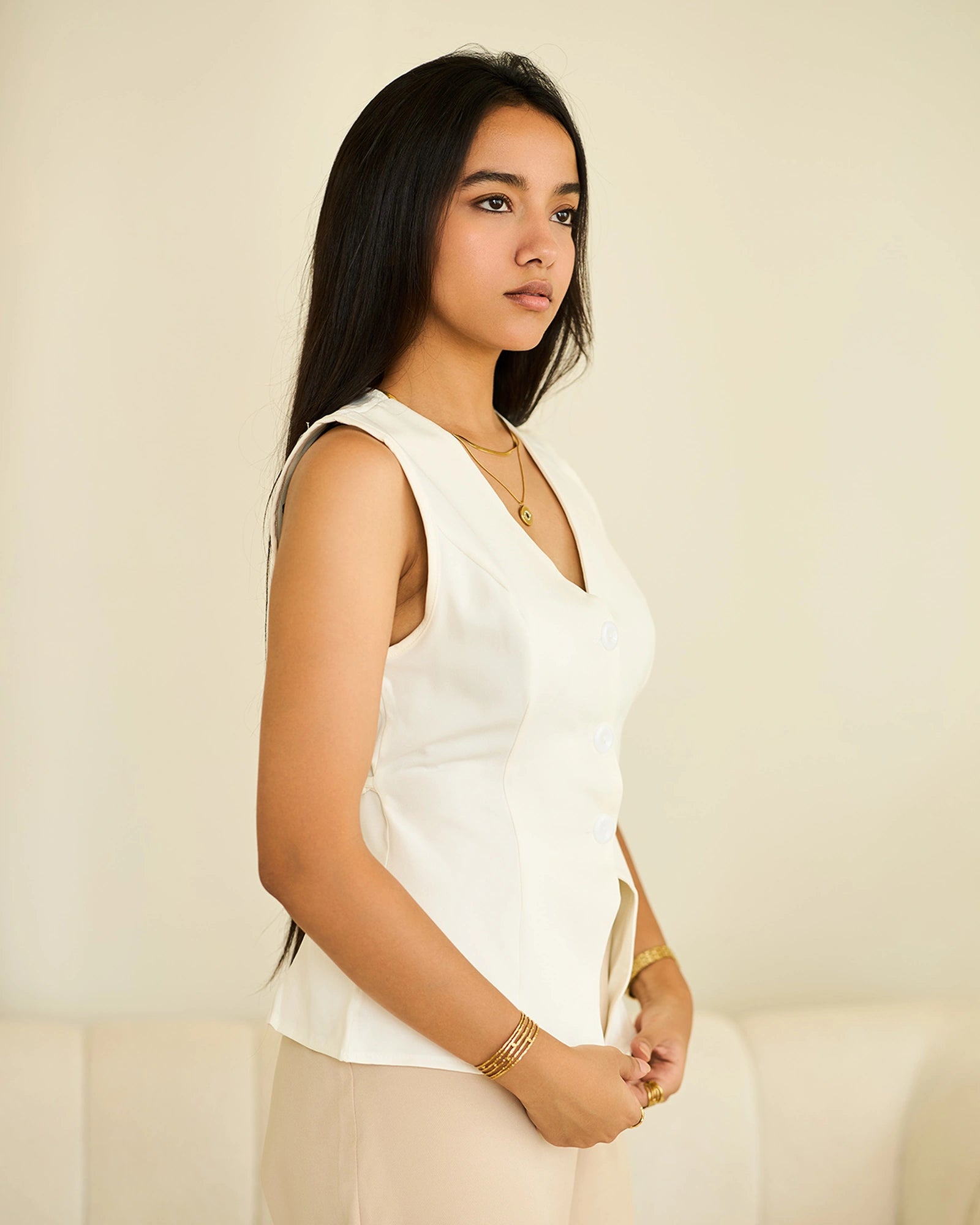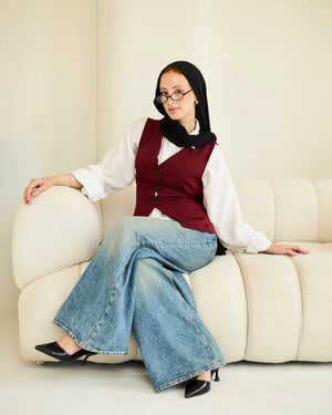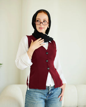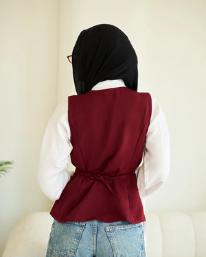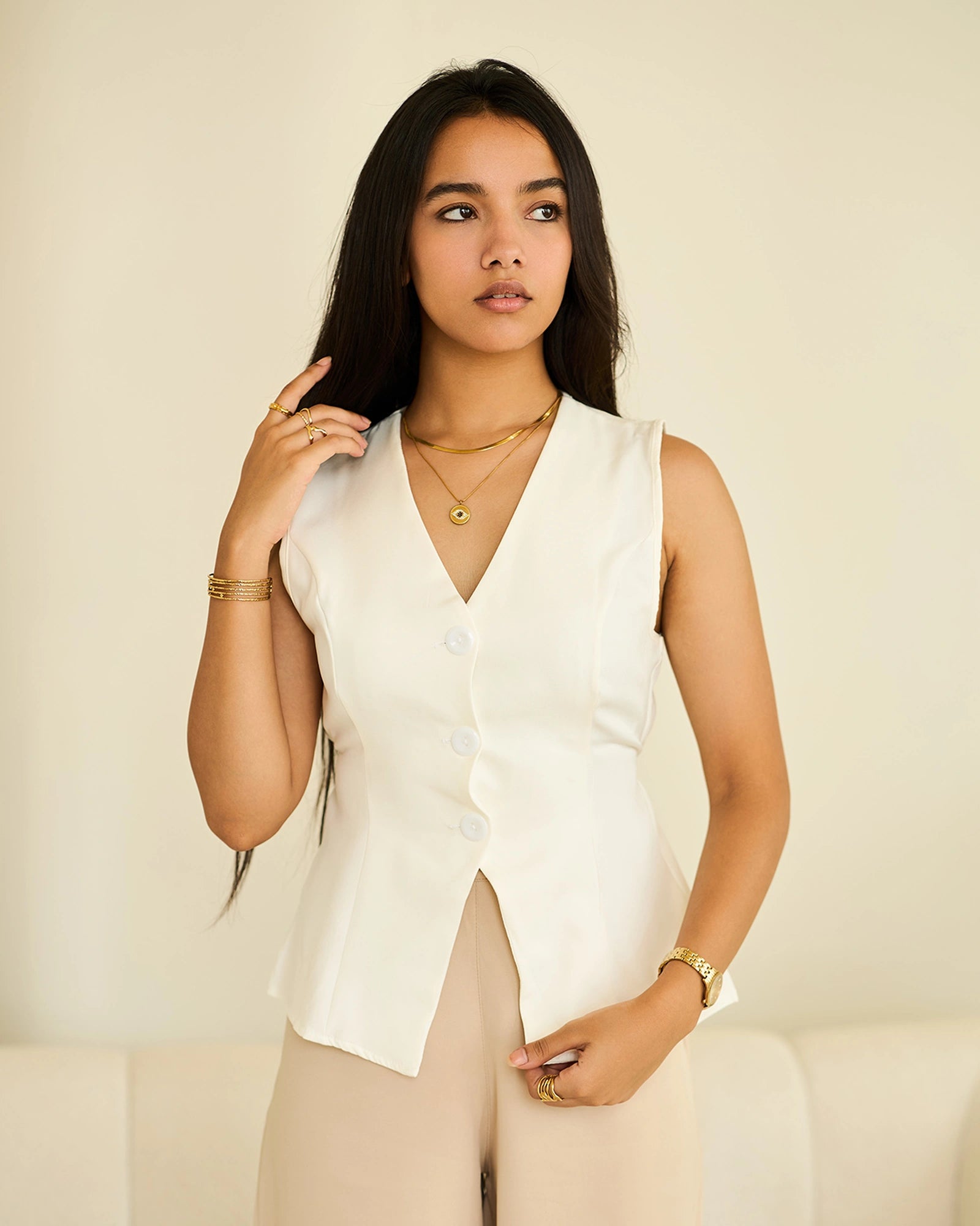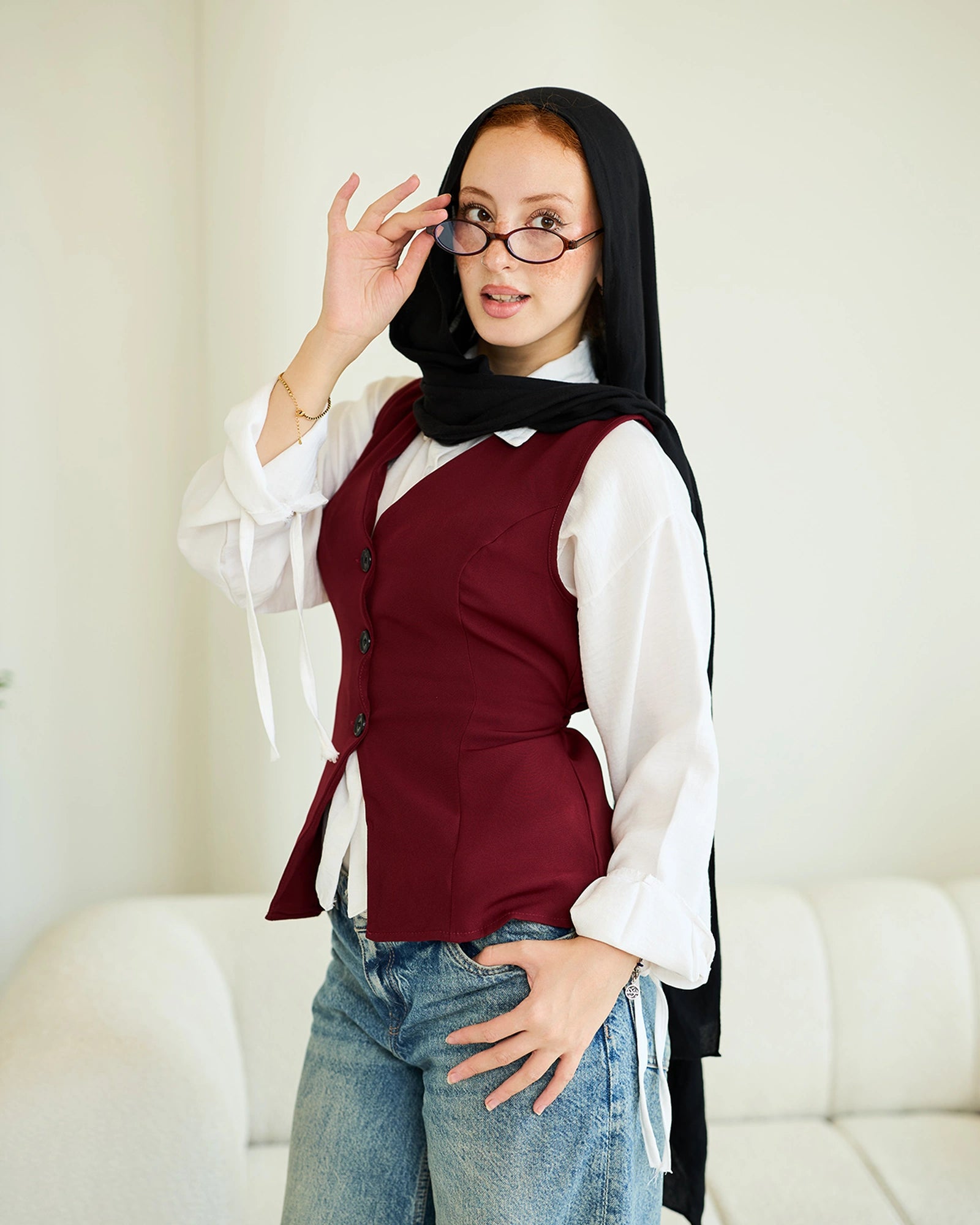Sleeveless, cropped, and buttoned at the front, with an adjustable back strap that pulls you in for that snatched waist look. Available in three must-have colors: white, black, and burgundy. Sizes: S, M, L. Wear it classy with tailored trousers, or keep it casual with your go-to jeans — it’s all about how you style it.